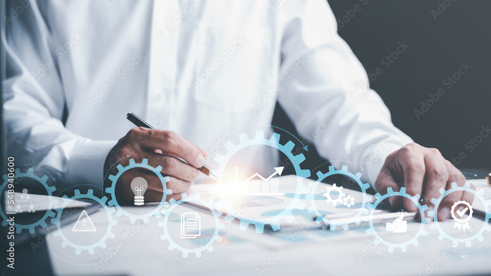 Businessman checking business growth document,concept of progress in development, financial efficiency and investment with business strategy for goals and opportunities in the industry future
