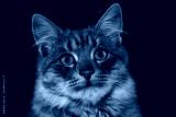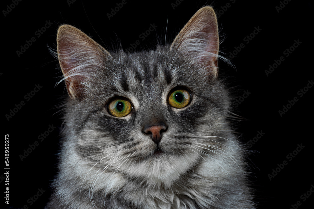 Black cat on a black background. Close-up view head and face of an elegant pet