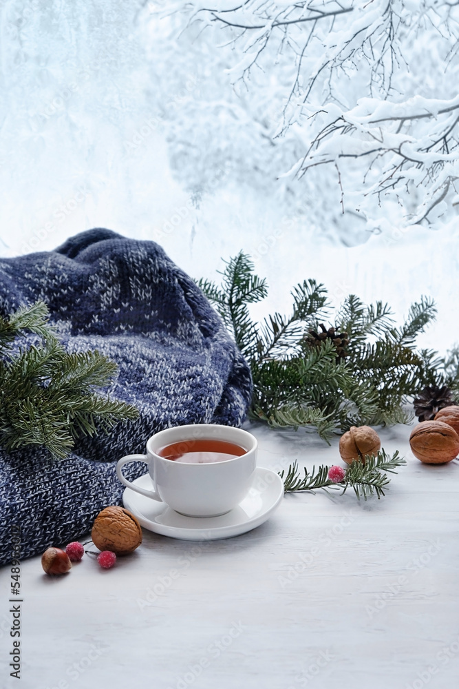 Tea cup, nuts, sweater, fir branches and frosty window. sweater weather, cozy home, comfort, relaxing concept. festive winter season. Christmas, New Year holidays background