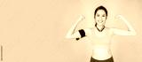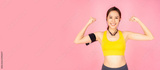 Strong powerful young asian woman showing biceps arm raised doing strong gesture Smiling girl looking at camera isolated on pink background Copy space Health care and Sport concept She has good health
