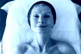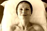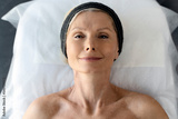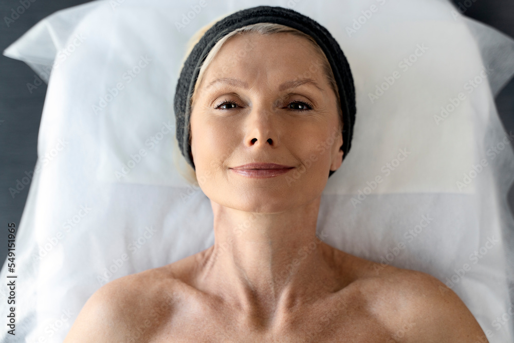 Top view of smiling senior woman laying at the couch after making an effective facial procedure