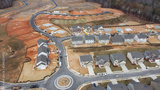 Aerial view two story homes under construction with slope foundation, envelope houses, traffic circle, working machine and portable restroom outside Atlanta, GA, US