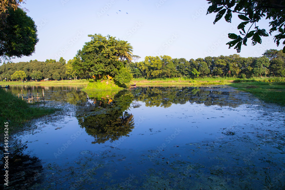 Natural landscape view Reflection of trees in the lake water against blue sky