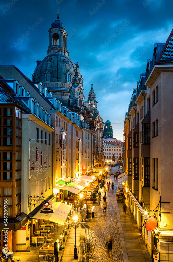 Dresden, Germany. Evening view from the street Munzgasse to the Dresden Frauenkirche, Dresden, Germany.