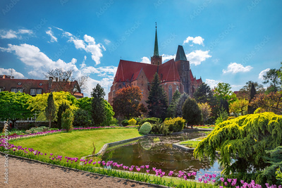 Wroclaw botanical garden with blooming tulips and Church of the Holy Cross and St. Bartholomew. Wroclaw, Poland.