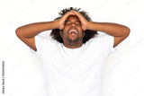 Frustrated African American man screaming with hands on head. Portrait of upset mature male model with dark curly hair in white T-shirt with closed eyes suffering from headache. Pain concept