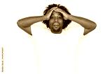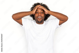 Amazed African American man with hands on head. Portrait of happy mature male model with dark curly hair in white T-shirt looking at camera, smiling, receiving good news. Shock concept