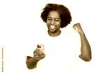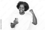 Happy African American man using phone with clenched fist. Excited mature male model with dark curly hair in white T-shirt looking at screen, winning in game. Modern technology, advertising concept