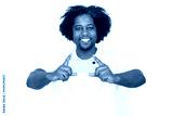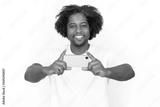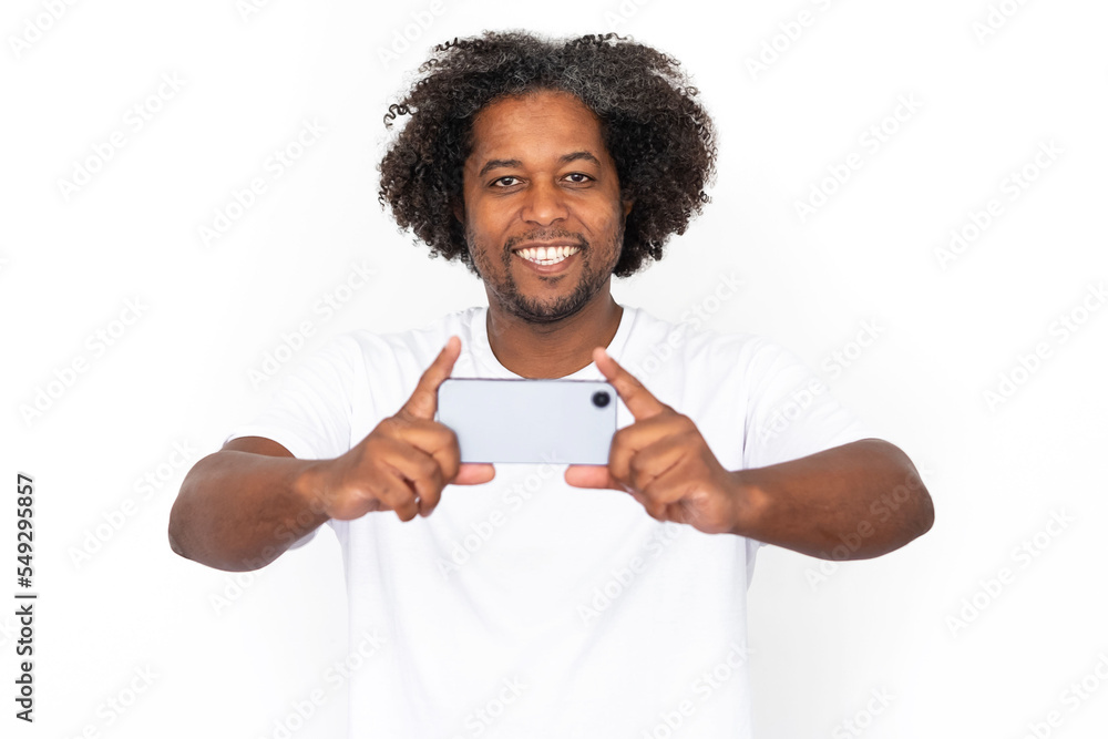 Portrait of happy mid adult man holding mobile phone. African American man taking selfie, looking at camera and smiling against white background. Mobile technology concept