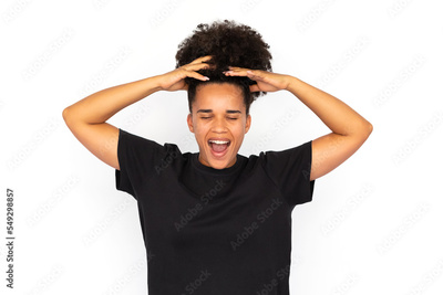 Portrait of young woman shouting in stress against white background. African American woman wearing black T-shirt screaming in frustration. Depression and despair concept