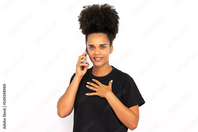 Portrait of happy young woman talking on mobile phone against white background. African American woman wearing black T-shirt looking at camera and smiling. Mobile communication concept