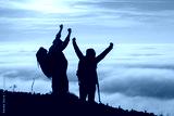 Excited family hiking on summer. Man and woman in casual clothes and with ammunition celebrating reaching peak. Hobby, active lifestyle concept