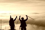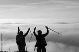 Delighted family hiking on summer. Man and woman in casual clothes and with ammunition celebrating reaching peak. Hobby, active lifestyle concept