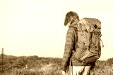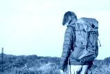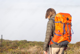 Back view of female hiker on summer day. Woman with big orange backpack standing at meadow. Hobby, active lifestyle concept