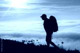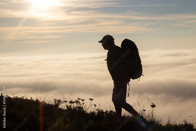 Silhouetted male hiker at sunset. Man with backpack going up hill in rays of setting sun. Hobby, nature, leisure concept