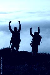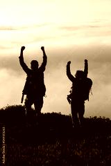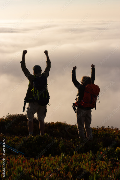 Motivated family hiking on summer. Man and woman in casual clothes and with ammunition celebrating reaching peak. Hobby, active lifestyle concept