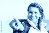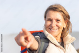 Portrait of cheerful elderly woman with backpack. Sporty woman in casual clothes smiling and pointing. Sport, adventure, hobby concept