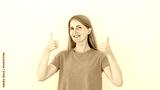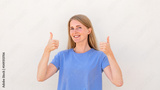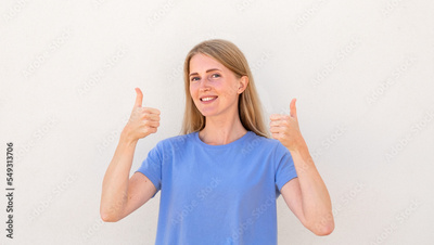Cheerful young woman showing thumbs up. Caucasian female model with blonde hair and blue eyes in blue T-shirt smiling and showing thumbs up as approval gesture. Approval, advertisement concept
