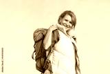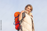 Portrait of happy elderly woman with backpack. Sporty woman in casual clothes looking at camera with bright smile. Sport, adventure, hobby concept
