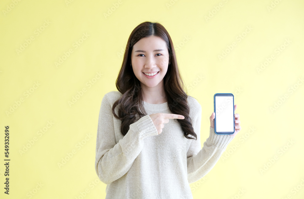 Young asian woman smiling, holding and pointing to blank screen display mobile phone while standing over isolated yellow background