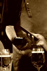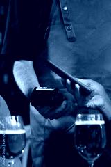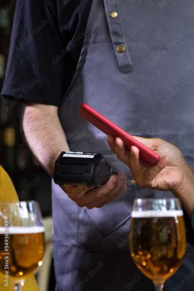Vertical close up of unrecognisable person paying bill in bar with mobile phone. Waiter holding dataphone.