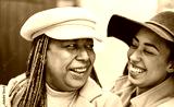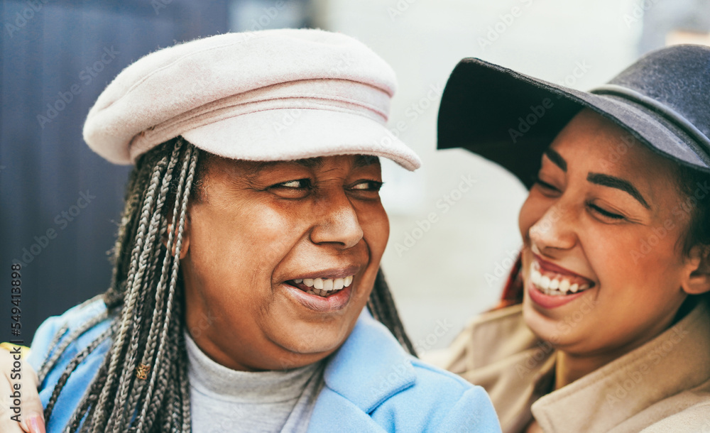 African mother and daughter having fun together during winter time outdoor - Focus on senior woman face