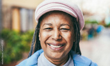 Happy african senior woman smiling on camera outdoor during winter day - Focus on face