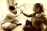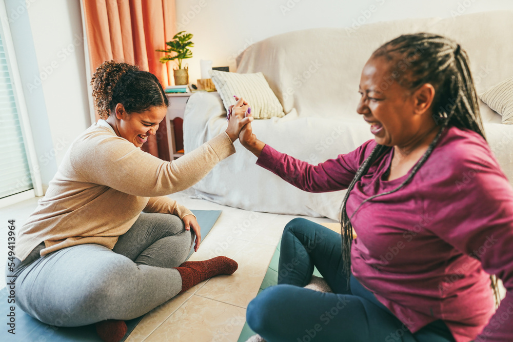 Mother and daughter doing fitness exercises at home together - Family and sport concept during winter time - Soft focus on girl face