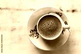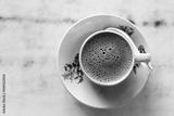 Overhead view of aromatic frothy coffee served in traditional chinese cup and saucer in kopitiam
