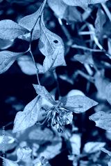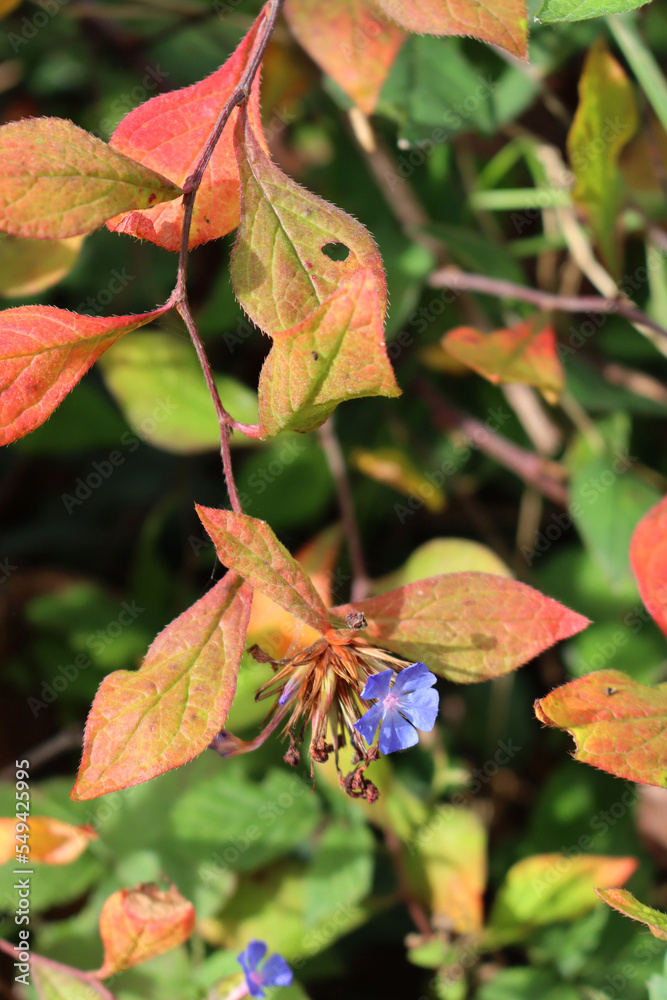 Ceratostigma wilmottianum branch with blue flowers on a dark background. Bush in autumn in the garden. Ceratostigma Plumbaginoides