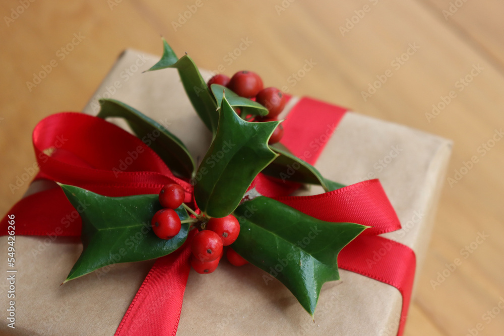 Christmas gift with Holly decoration with red berries on a wooden background with copy space