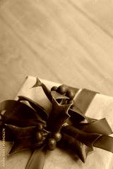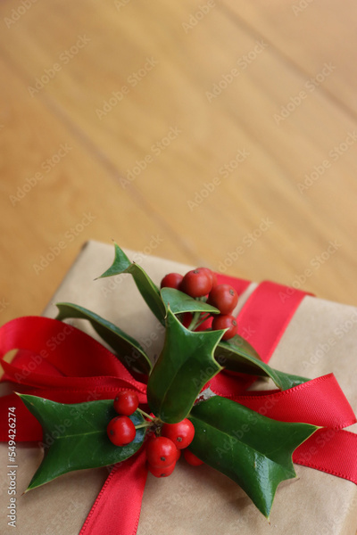 Christmas gift with Holly decoration with red berries on a wooden background with copy space