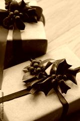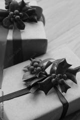 Two Christmas gifts with Holly decoration with red berries on a wooden background with copy space