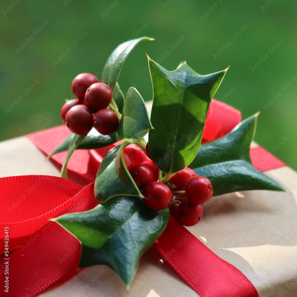 Christmas gift with Holly decoration with red berries on a green blurred background with copy space