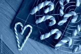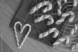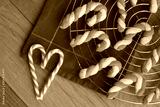 Christmas cookies in shape of a candy cane on a wire rack with red tablecloth with real candy canes in shape of heart