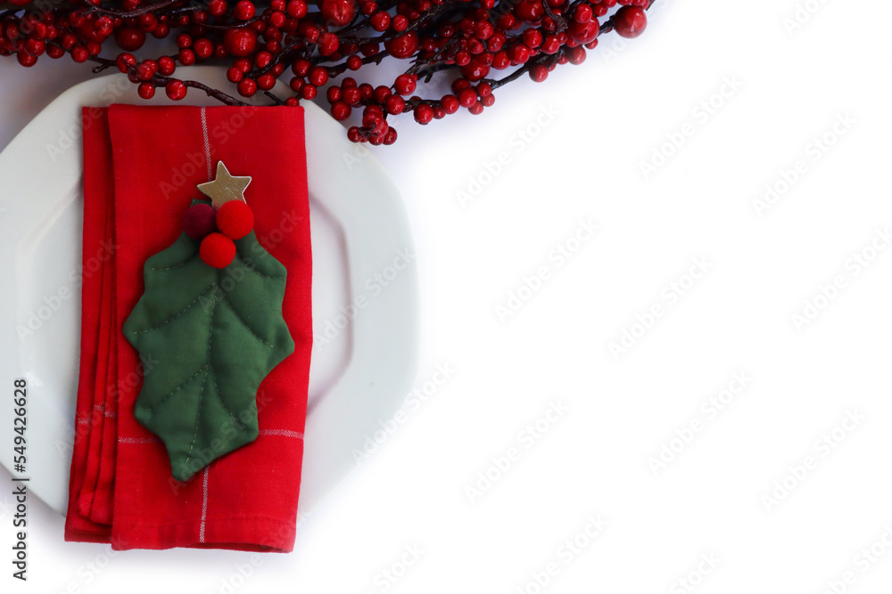 Festive table setting for Christmas with red berries decoration, White ceramic plate. Holly leaves and red tablecloth on a white background