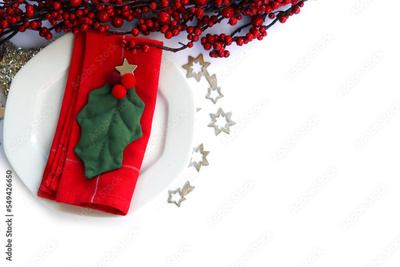 Festive table setting for Christmas with red berries decoration, White ceramic plate. Holly leaves and red tablecloth on a white background