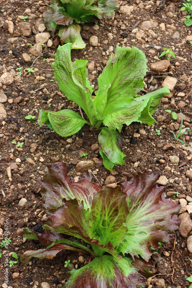 Close-up of red and green Chioggia Radicchio plants in the field. Italian radicchio cultivation on winter season. Italian Chicory. Cichorium intybus