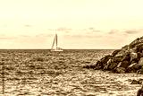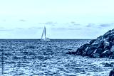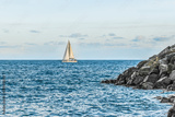A white yacht sails past a pile of large boulders in blue sea water. Beautiful seascape
