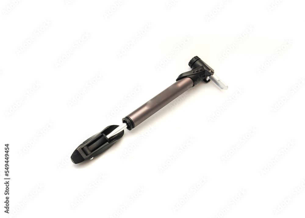 Open position of compact mini bike pump fit with presta and schrader valve made of aluminum alloy and durable plastic isolated on white background
