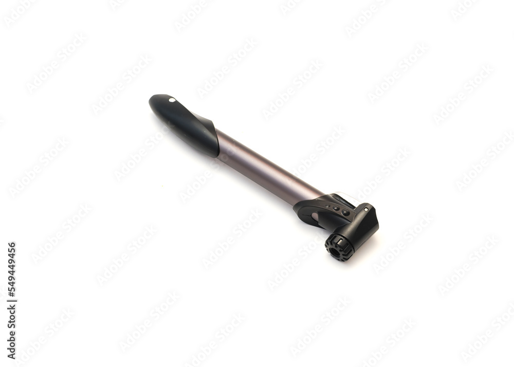 Compact mini bike pump fit with presta and schrader valve made of aluminum alloy and durable plastic isolated on white background