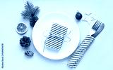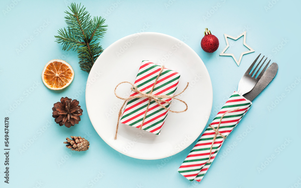 New year dinner table place setting with plate, present box, christmas eve fir branch on red background. Minimal frame set, composition for menu or card. Flat lay, empty space, top view