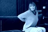 Side view elderly sad woman 50s year old wear casual clothes sits on blue sofa Feels bad suffering from pain spasm back sprain stay at home flat spend free spare time in living room indoor grey wall.