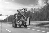 Tractor with road sign arrow detour and brush arrow crane for washing bumper or highway guardrail.