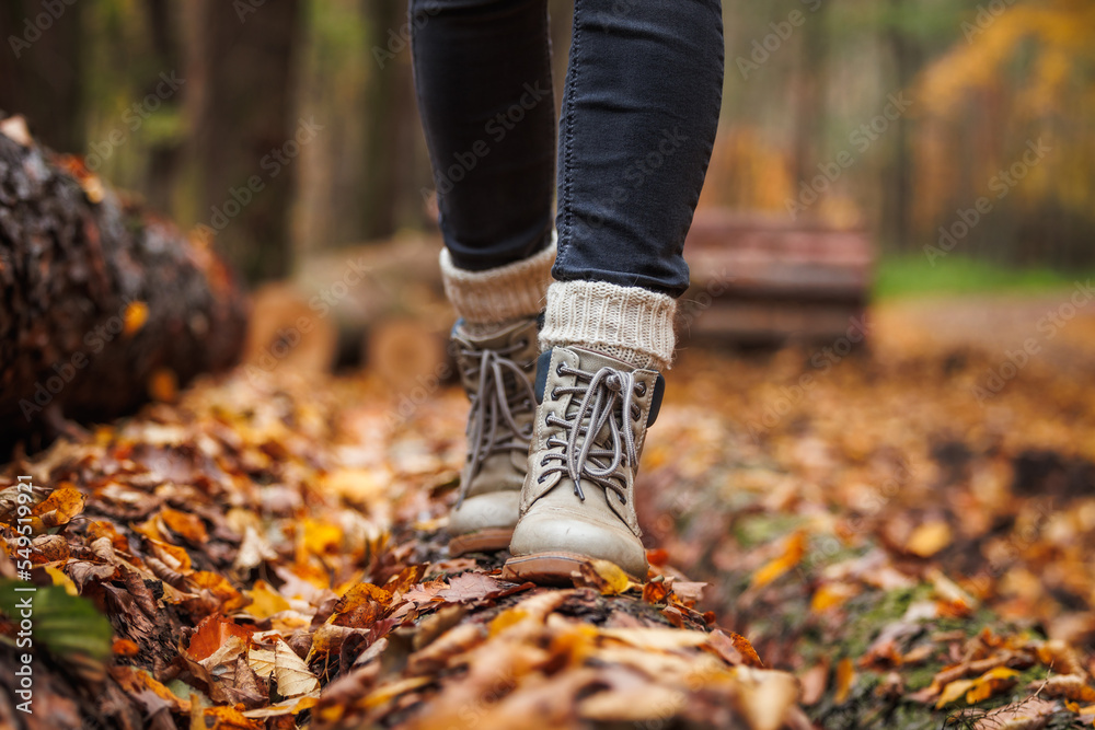 Walking in autumn forest. Leather hiking boot with knitted socks