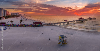 Sunset at Clearwater beach with Pier 60 fishing pier, white sand beach dramatic colorful sky