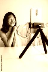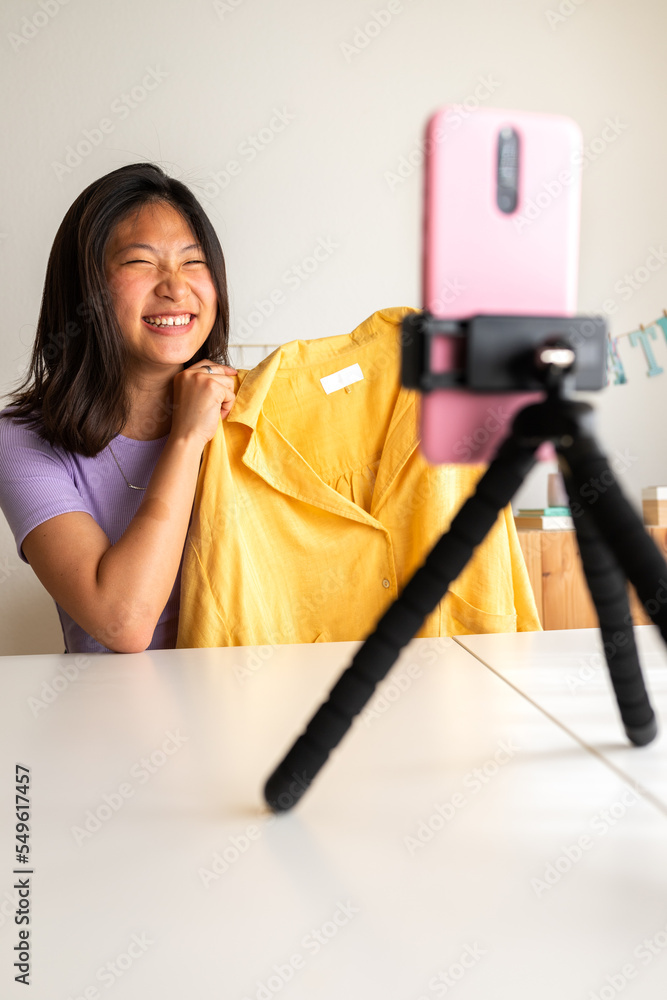 Asian female fashion influencer recording video for social media showing clothes to followers. Vertical.