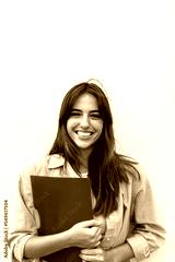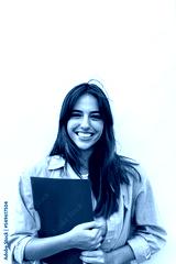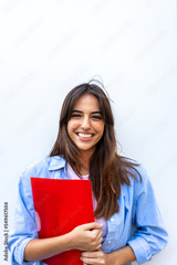 Vertical portrait of happy, smiling female university student looking at camera holding red folder.