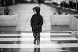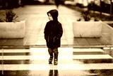 An urban child is crossing the crosswalk downtown on the city street on rain.