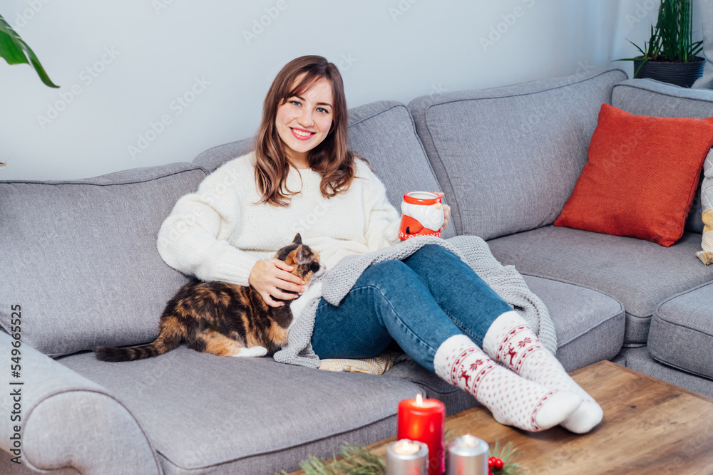 Portrait of smiling woman with cup of hot drink petting cat on sofa at home while watching movie, TV with christmas decoration atmosphere. wear jumper, warm socks. Cozy, comfortable winter concept